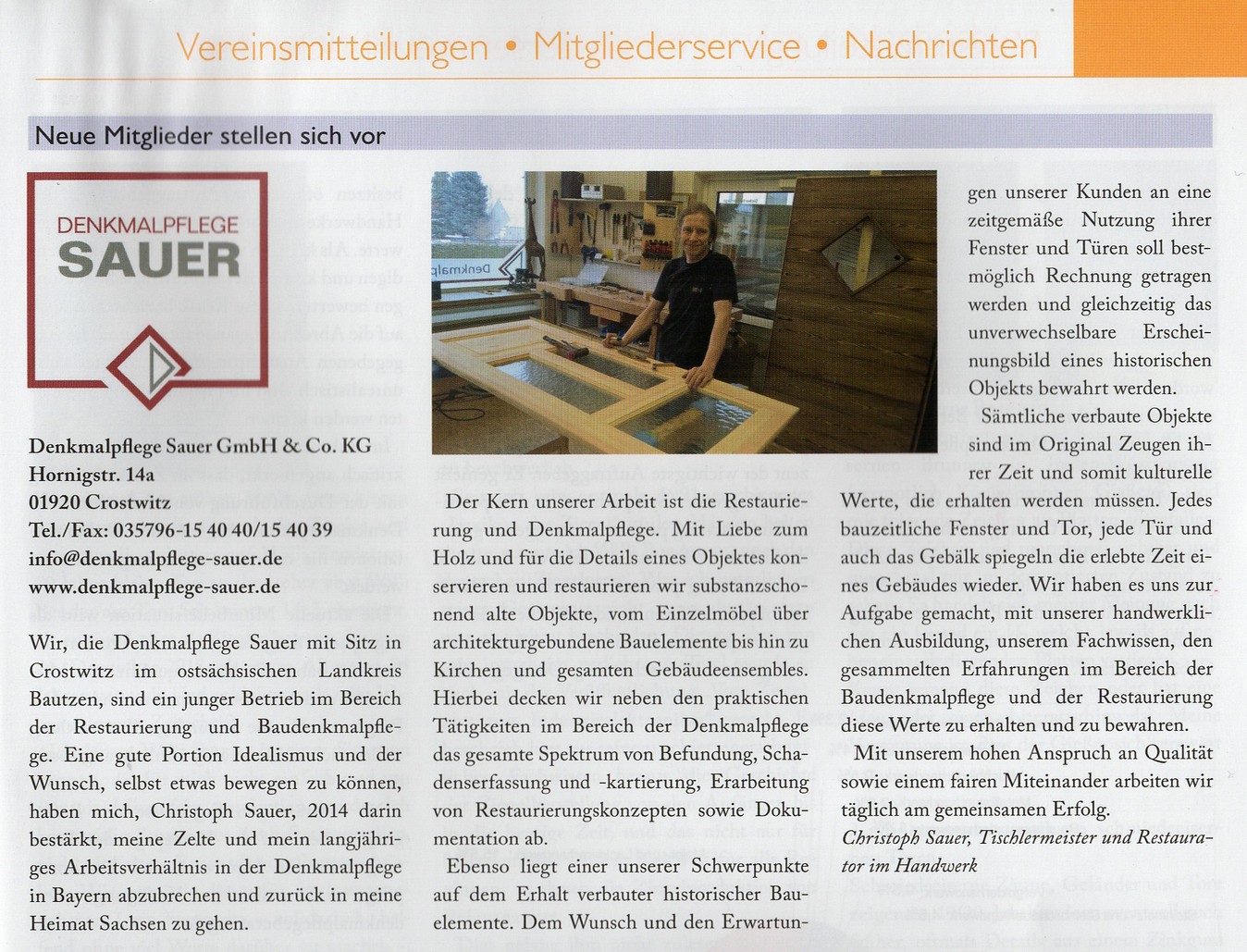 Im Jahre 2014 kehrte Christoph Sauer mit seiner Familie zurück in die Lausitz und fand in Crostwitz die optimalen Räumlichkeiten für seine Werkstatt. Inzwischen hat er dort schon viele interessante Gegenstände restauriert – so z.B. die Fenster der Kapelle in Spohla, die Portale in der Görlitzer Synagoge, Fenster und Türen des Klosters „St. Marienthal“ in Ostritz und das Kirchgestühl in der Pfarrkirche Wittichenau. Zeitgleich realisierte er verschiedene Arbeiten für die Stadt München. Momentan werden für das Kloster in Ostritz weitere barocke Türen restauriert.